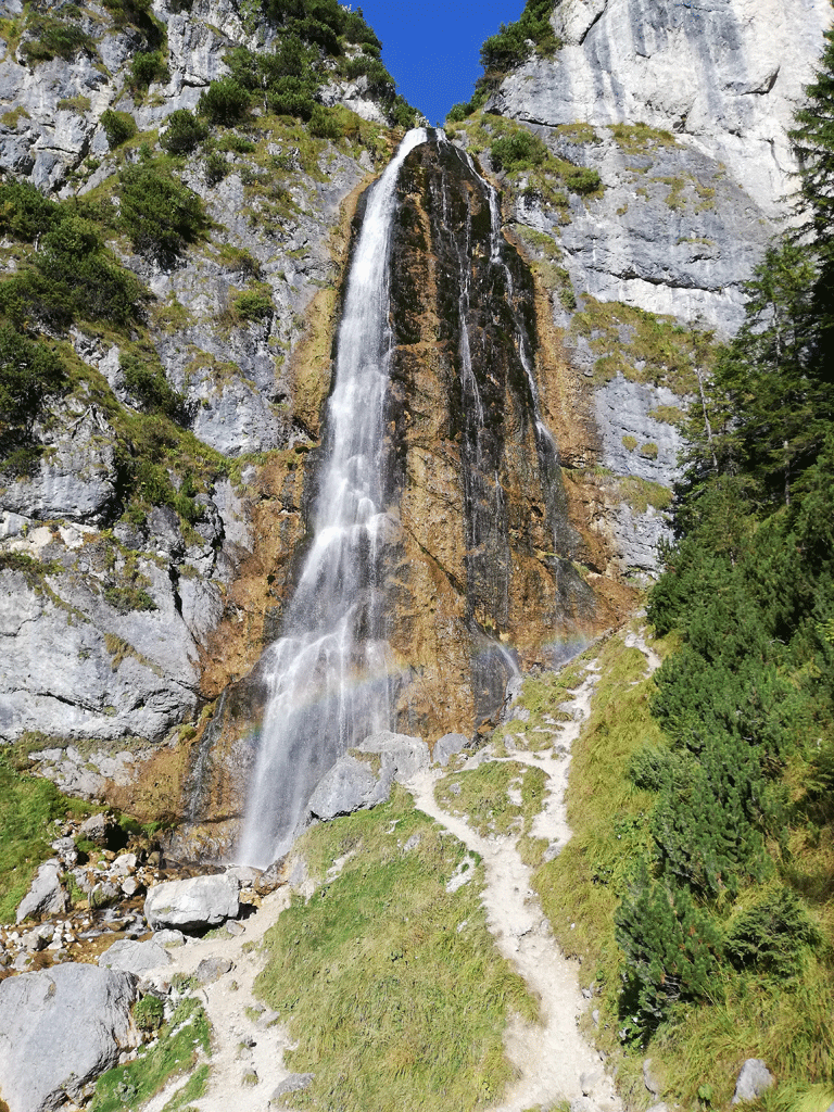 Etwas steiler bergab führte uns der Weg dann zum Dalfazer Wasserfall, wo wir unsere Beine in das kühle Nass eintauchten. Beim kontemplativen Abkühlen, beobachteten wir ein paar mutige Kletterer dabei, wie sie die Felswand über dem gewaltigen Wasserfall hochstiegen. Hut ab!